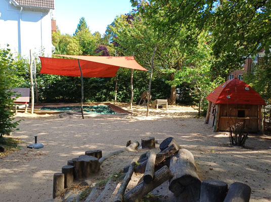 Manchmal beginnt ein Tag mit einem Schritt über die Schwelle – und schon ist man mittendrin im Märchen. Unser Außengelände ist kein gewöhnlicher Spielplatz. Es ist ein verwunschener Ort, an dem rote Segel wie Drachenflügel über den Himmel spannen und Baumstämme sich zu geheimen Pfaden formen.