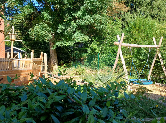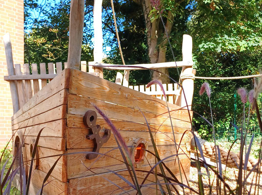 Der hintere, von der Straße aus nicht einsehbare Teil unseres Außengeländes ist ein Hafen der Möglichkeiten. Zwischen Planken und Masten, Steuerrad und Ausguck verwandelt sich der Alltag in ein Abenteuer. Die Kinder werden zu Kapitäninnen und Forschern, zu Matrosen und Geschichtenerzählern – und das Schiff aus Holz trägt sie dorthin, wo ihre Fantasie sie ruft.